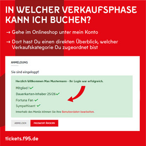 - Vorverkauf für Mitglieder, Dauerkarteninhaber & registrierte F95-Fans, die in der Vergangenheit regelmäßig Tickets im Online-Ticketshop gebucht haben